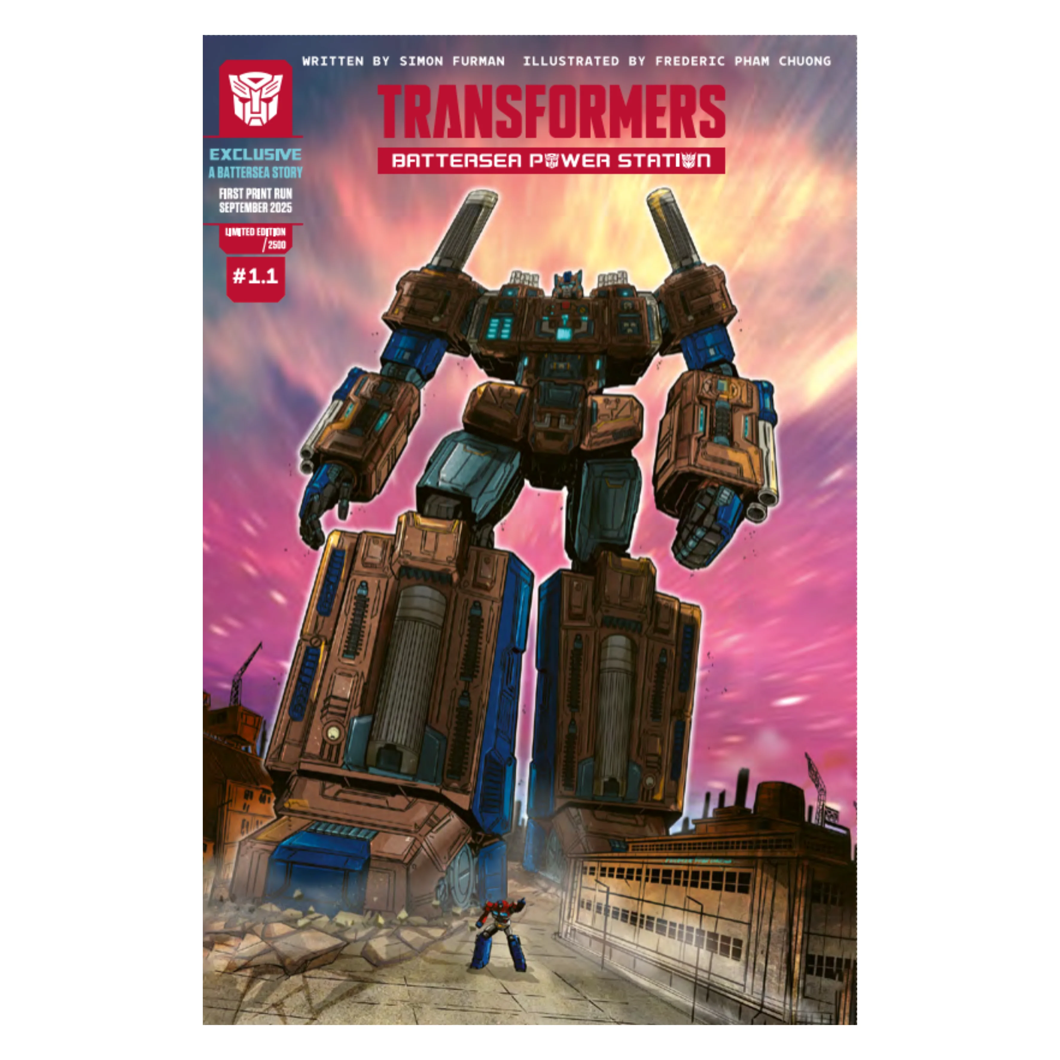 Step into Transformers history with this exclusive hexagonal foldout poster, unveiling the very first mini comic to showcase the brand-new Titan rising from Battersea Power Station!