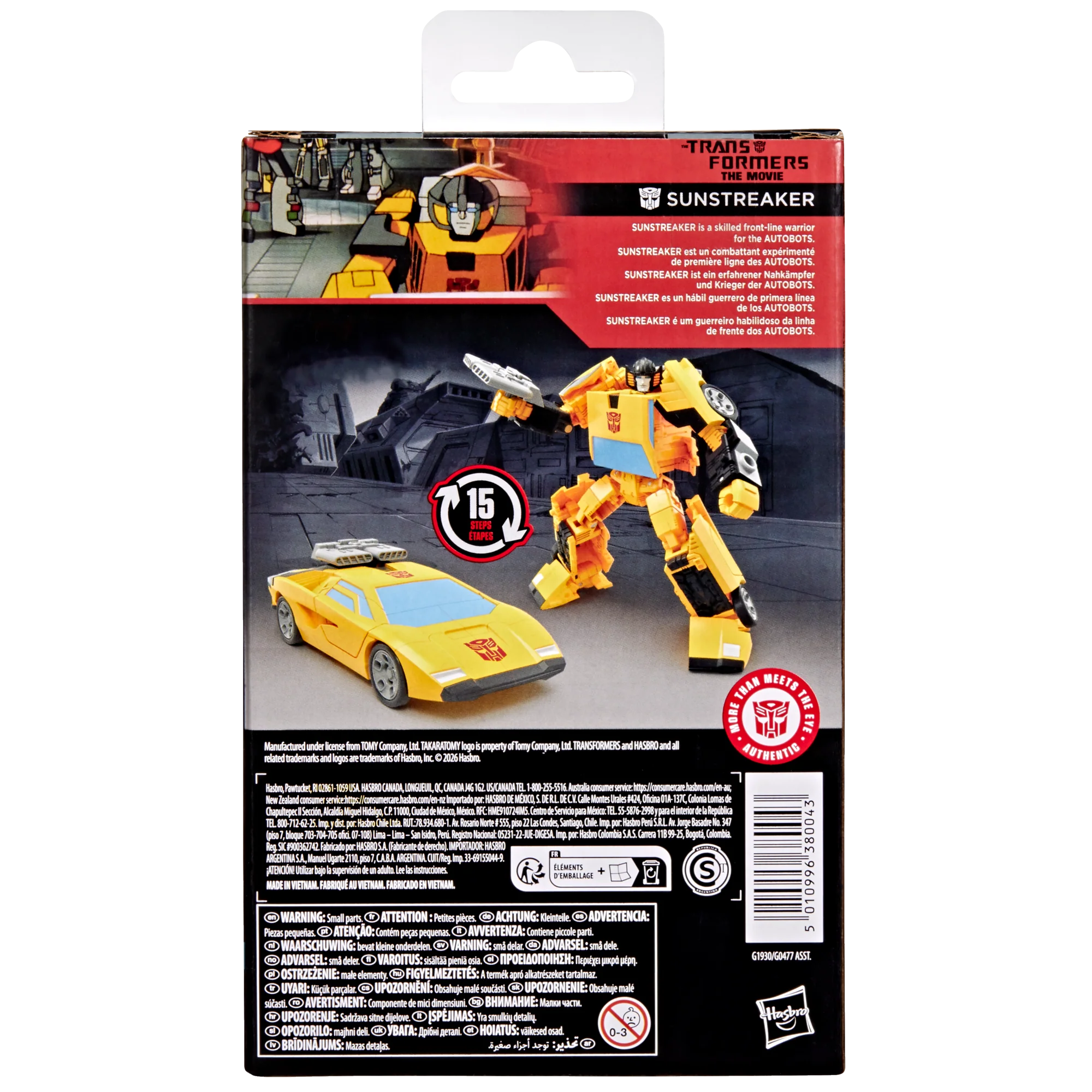 Experience the epic action of The Transformers: The Movie with the Studio Series Sunstreaker toy! The 4.5-inch (11 cm) figure converts from robot action figure to car mode in 15 steps. With movie-inspired details, good poseability, and a blaster accessory that attaches in both modes, this Transformers Sunstreaker action figure makes an awesome addition to any collection. Look for more Transformers collectible toys (sold separately, subject to availability) featuring favorite characters like Optimus Prime, Bumblebee, Megatron, and more to create a lineup that is — More Than Meets the Eye.