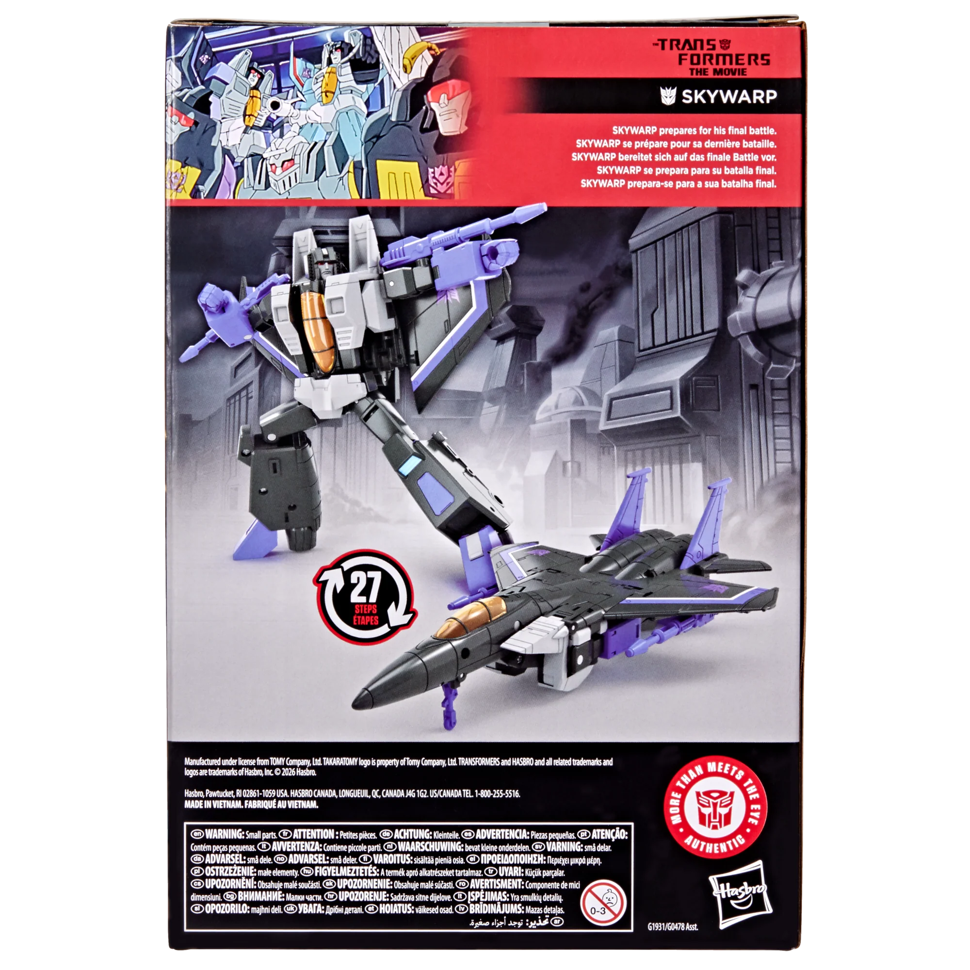 Experience the epic action of The Transformers: The Movie with the Studio Series Skywarp toy! The 6.5-inch (16.5 cm) figure converts from robot action figure to jet mode in 27 steps. With movie-inspired details, intricate poseability, and blaster accessories that attach in both modes, this Transformers Skywarp action figure makes an awesome addition to any collection. Look for more Transformers collectible toys (sold separately, subject to availability) featuring favorite characters like Optimus Prime, Bumblebee, Megatron, and more to create a lineup that is - More Than Meets the Eye.